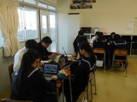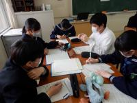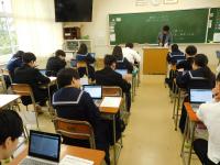 1年生の英語は自己紹介文を書いています。男子バレー部や女子テニス部など部活動を中心に書いている人が多いようです。社会は仏教、キリスト教、イスラム教について調べています。理科では金属の密度を測定しています。質量はデジタル計量器で、体積は水の中に入れて計測しています。