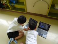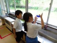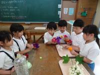 5月にあさがおの種を植えました。しばらくして芽が出てきました。少し前の話になりますが、朝、玄関で1年生が「あさがおの芽がでたよ。」とうれしそうに教えてくれました。早速、いっしょにあさがおの鉢を見に行くと、芽がたくさん出ていました。子供たちは、水やりをしながら「あさがおの芽は3つでてるよ。」や「5つ全部でてきたよ。」、「むらさき色のお花かな。何色のお花がさくかな。」と花がさくのを楽しみにしている様子が伝わってきました。何色の花がさくかな?