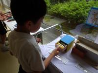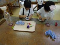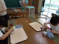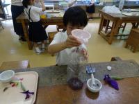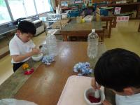 花びらと水を合わせてすりつぶしました。花びらのきれいな色水ができ「オレンジジュースみたい」や「アメリカンチェリーの色になった」などと楽しんでいました。