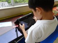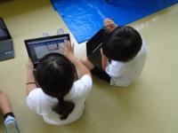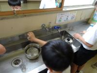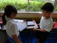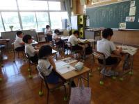 2年生が「かさ」の学習で、容器(鍋やカップ、ジュースの入れ物など)にどれだけ水が入るか予想し、実際に水を入れて「dlます」で何倍分か調べました。調べた様子を自分で一人一台端末で写して、ペアで報告し合いました。