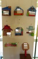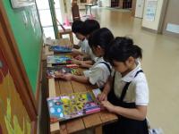 ろうかが作品展になっています。展示してあるパズルやビー玉めいろで遊んでいる姿も見られます。