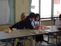 1年生のはじめての給食。メニューはみんな大好き「カレーライス」です。なんと、お祝いイチゴクレープもありました。1年生は「おいしいよ」とニコニコ笑顔で、完食しました。食べ方や片付けの方法をやさしく教える姿もありました。