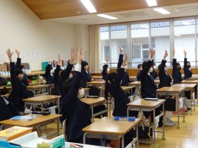 6年生は,凛々しい「天井挙手」や「反応」「目力」に協力して取り組み
