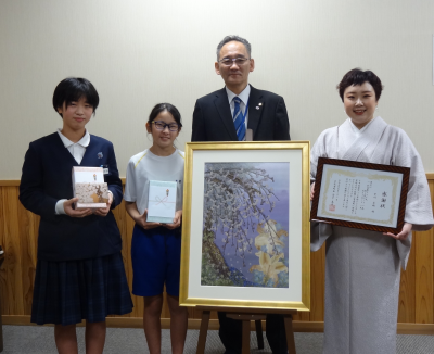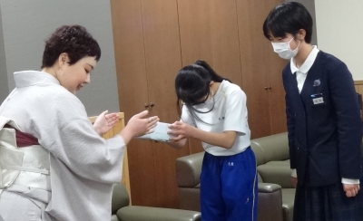 児童会代表の西井彩貴さん,大根麗さんが,中川さんから絵はがきを手渡されました。