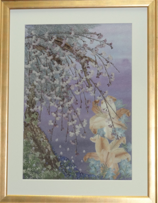 しだれ桜やユリの押し花が,大胆な構図で配された素晴らしい作品です。