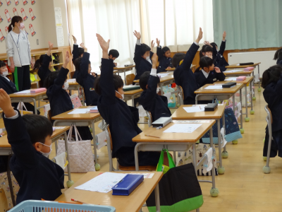 1年生も,お兄さん・お姉さんのよい姿勢や天井挙手を見て,
