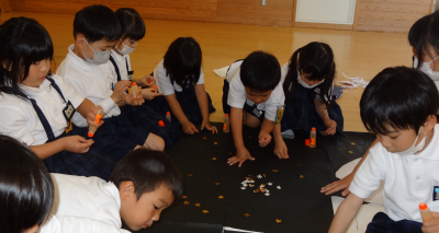 6年生が準備した星型のおりがみに上手にのりをつけて、バランスよく