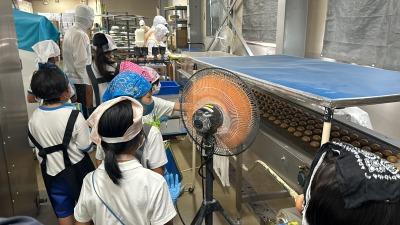 お菓子工場では、三角巾・エプロン・手袋をつけて工場の中に潜入!