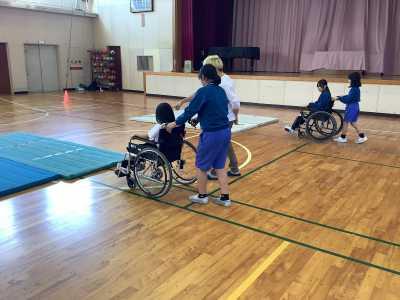 その後の車いす体験では、ゆっくり安全に車いすを動かすことや、優しく声掛けをすることを学んで実践することができました。