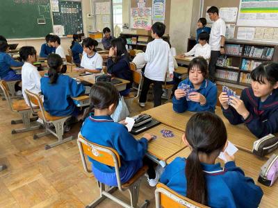 分数と小数のカードでババ抜きしている5年生。なかなか難しいけど、自分たちで作ったカードだから、よくわかっているようです。