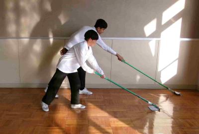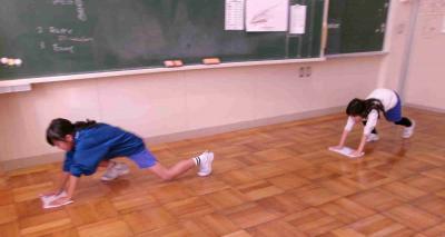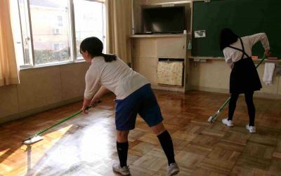 この日は、ワックスがけ。みんなで協力して、各教室の荷物を出しました。そして、みんなで教室の床を水拭きでピカピカにした後、環境委員の人と先生方で、教室のワックスがけをしました。