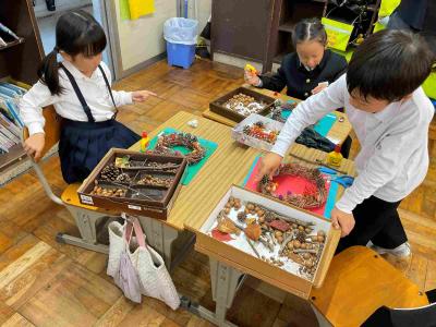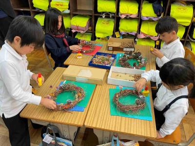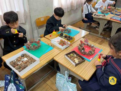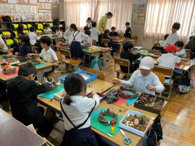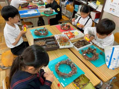 リースの輪の部分は、1年間観察をつづけたあさがおのつるの部分でつくりました。かざりには、秋見つけでひろったどんぐりゃ葉っぱ、赤い実やまつぼっくり、ドライフラワーなど。どの子も一生けんめい、自分のリーズづくりに夢中になっていました。
