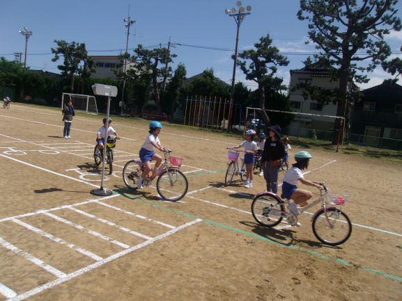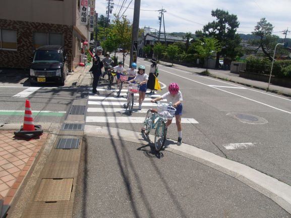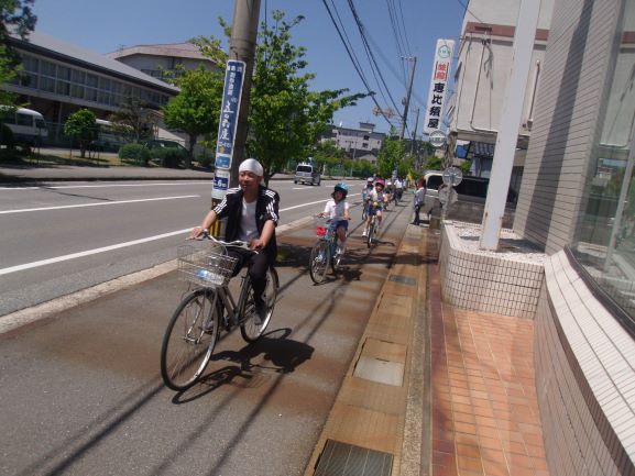 DVD視聴、講習の後、1・2年生は、小グループに分かれての歩行訓練。3年生は、自転車免許取得に向けて、グラウンドでの自転車安全教習、そして市街地コース使っての実技講習をしました。新しく免許をもらった3年生の皆さん、交通ルールを守り、慎重に乗ってくださいね。