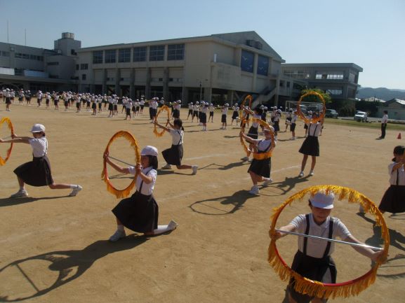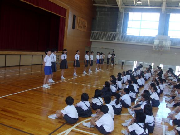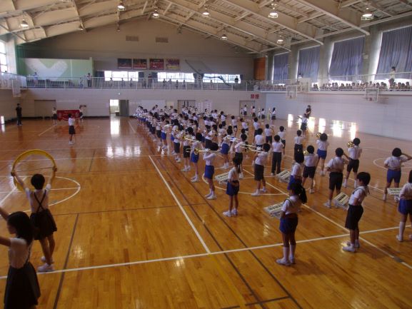5月29日(水)5限目に、全校集会が開かれました。今回のメインは、5・6年生金管鼓隊のドリルお披露目です。演奏前は、どの子も練習の成果を発揮しようと、良い緊張感で準備している姿が印象的でした。