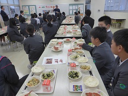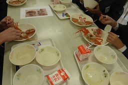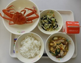 河井共同調理場では、6年生が香箱ガニを味わいました。