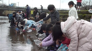 4年生は、ペットボトルで育てていたヤマメの稚魚を三角州の河原田川に放流しました。元気に大きくなってねと声をかけながら、川に水といっしょに放ちました。