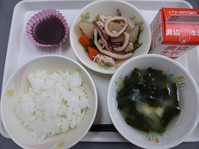 ごはん、打ち豆汁、いしる煮、水ようかん、牛乳です。