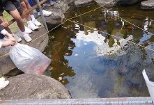 6年生が中庭の池に放流しました。かわいいコメットが群れをなして、元気に泳いでいます。大切に育てます。