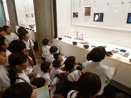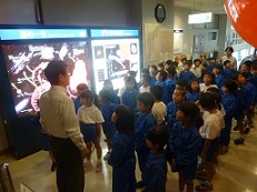 その後、美術館に行きました。全学年が順番に美術鑑賞を行っています。今日は1年生でした。美術館の方に説明をしてもらいました。