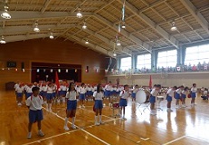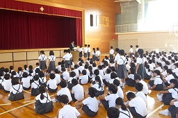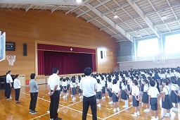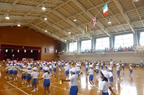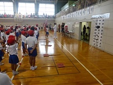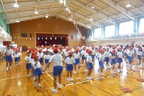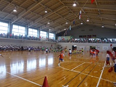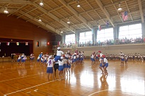 雨で運動場での開催はここ数日間は無理との判断で、たくさんの保護者や地域の方にご参観いただければと考え、日曜日に体育館での実施としました。急な予定の変更で、保護者の皆様には、大変ご迷惑をおかけしました。皆様のご理解とご協力のお陰で無事に、終えることができました。ありがとうございました。