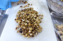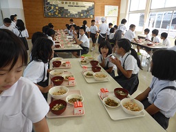 輪島市では、輪島の食文化を味わってもらうために地場産物を給食に提供しています。生さざえ67kgを茹でて殻と内臓を取り除いたむき身6kgをいただきました。それをスライスして、五目ごはんを作りました。茎わかめは、きんぴらにしました。