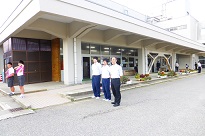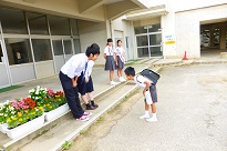 河井小学校の児童は、高校生のお兄さん、お姉さんに、大きな声で「おはようございます」の朝のあいさつをしています。気持ち良く一日が始まります。