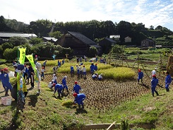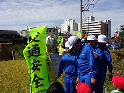 すずめから、籾を守っていた案山子に「交通安全」ののぼりをかけて、交通安全キャンペーンも行いました。表さんから、稲の刈り方を習いました。