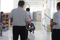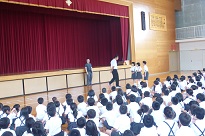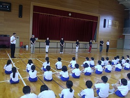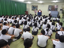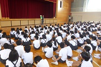 みんなで体育館に移動して、もしもの時に自分で自分の身を守る方法について、警察署の方より教えてもらいました。
