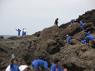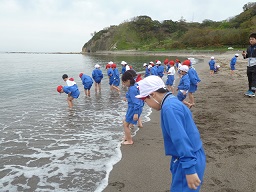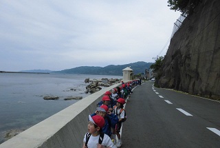 1年生は袖ヶ浜まで歩きました。鳳来山公園でお弁当を食べました。