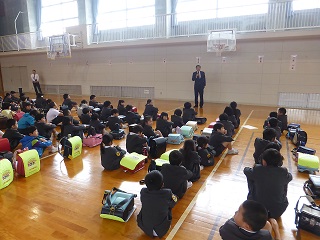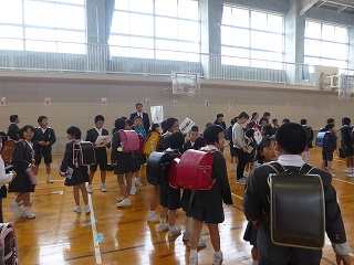6限目に、体育館で集団下校訓練を行いました。6年生は自分の地区の1年生を迎えに行って、連れて来ました。そして、各地区ごとに集まりメンバーを確認しました。