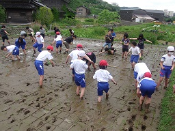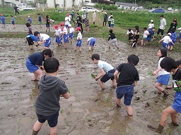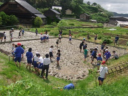 4年生は、田植えを行いました。塚田町の表さんの田んぼで、体験をさせてもらいました。