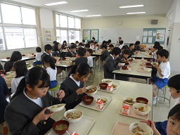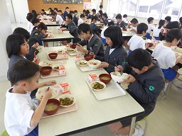 モグモグタイムは、良く噛んで食べましょう。1年生は、歯が抜けていて、ちょつと噛み切りにくそうです。今日は輪島産の天然ワカメの茎の炒め物です。みそ汁は、輪島塗のお椀です。