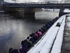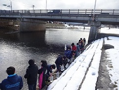 2年生と4年生が学校で孵化したやまめを三角州に放流しました。大きくなってね。
