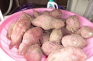 洗われて、乱切りにされたさつまいもが、大きなザルに入っているのを見つけました。