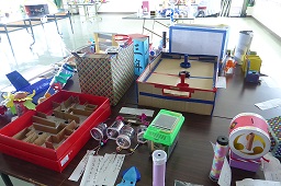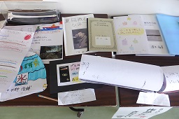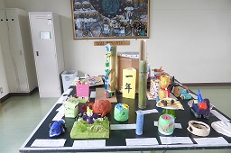 集会室 風で夏休みの作品を展示しています。みんな、上手に作ってきました。