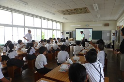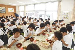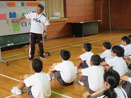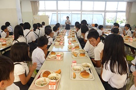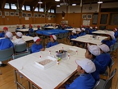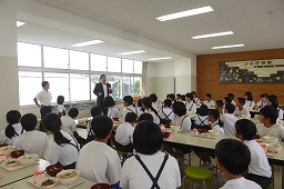 ランチルームでは、1年生と6年生が農林水産課の延命さんより説明を聞きました。