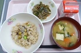 五目サザエごはん、味噌汁、茎ワカメのきんぴら、牛乳です。おいしくいただきました。