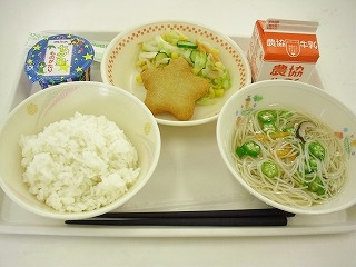 ごはん、星のコロッケ、コーンサラダ、そうめん汁、七夕デザート、牛乳