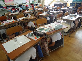 校内放送にしたがって、それぞれの授業場所で、しゃがむ、かくれる、じっとするといった行動を約1分間行いました。