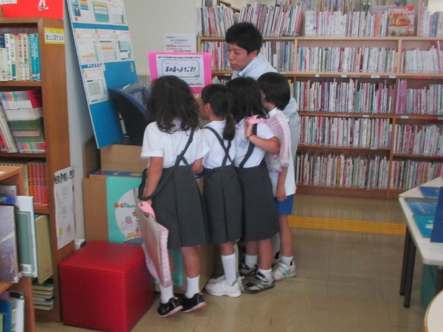 職員の方に読み聞かせや、本の検索の仕方を教えていただいたりして、1年生は興味津々!!