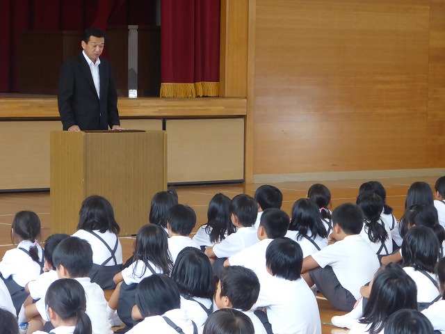 訓練の後には、低学年は体育館、高学年は集会室『風』にて、不審者に出会ったときの対応についてお話しをききました。