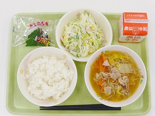 ごはん、ぶたキムチ鍋、シルバーサラダ、かしわもち、牛乳