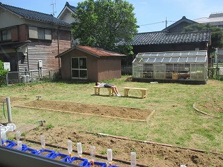 2016年5月13日 13時47分先日、教室棟裏にある畑や温室の周辺をキレイに整備し、ベンチを設置しました。