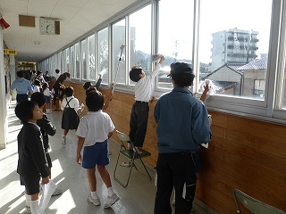 学年ごとに、それぞれの担当の場所へ移動し、窓ふき開始。