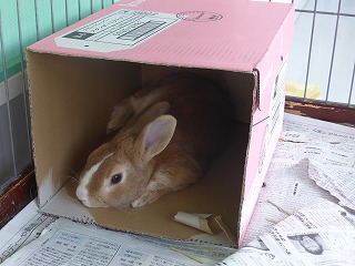 隠れ家兼おもちゃとして、ポンタの小屋に段ボールが入れられています。