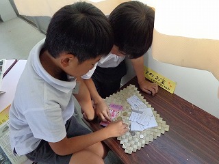 お話しや写真での紹介だけでなく、実際にサモアで流通しているお金を触ったり、衣装を着てみたり。