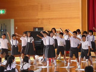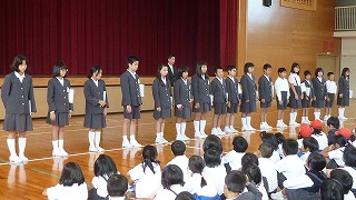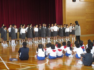 金曜日の合唱コンクールを前に、5年生が全校生徒の前でコンクール曲を披露してくれました。