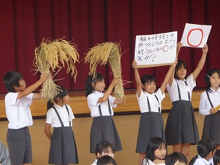 今日の全校集会では、4年生が総合学習で勉強した米や稲について紹介をしてくれました。