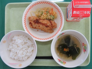 ごはん,とびうおのフライ,そうめんかぼちゃのゴマ和え,すまし汁,牛乳