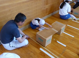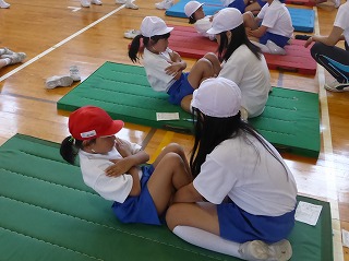 体育館では、長座体前屈、立ち幅跳び、上体起こし